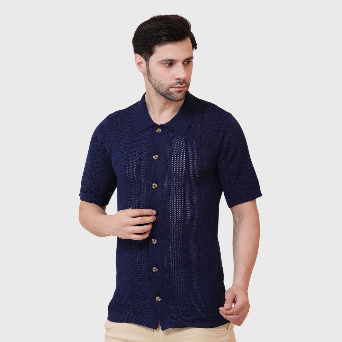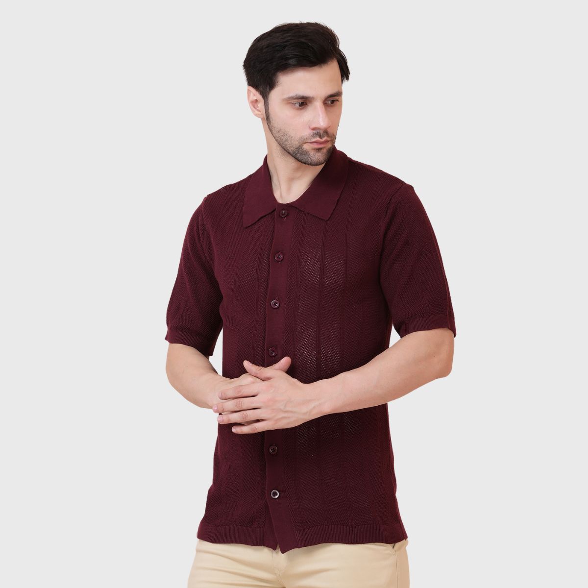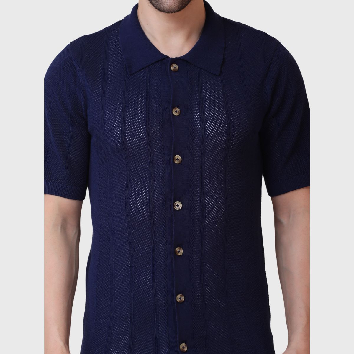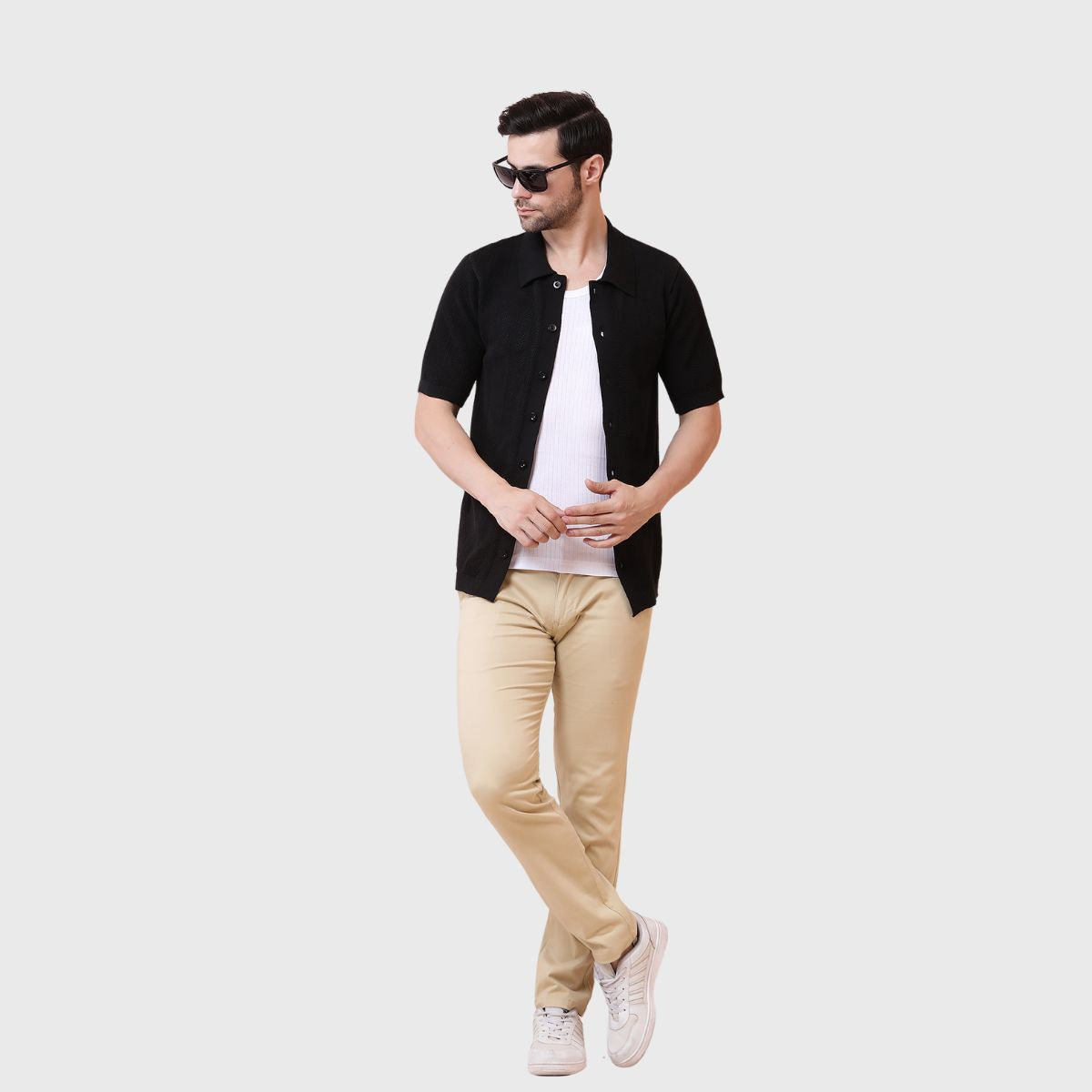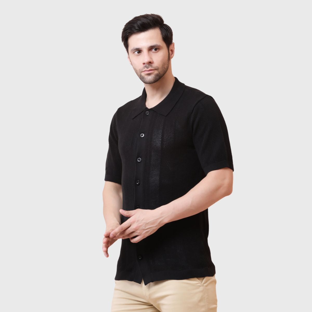 NOQUO presents a stylish black button-down polo shirt for men with a unique textured knit design. Made from a breathable cotton blend, this short-sleeve shirt is ideal for everyday casual and smart-casual dressing. Perfect for summer wear and easy to maintain.