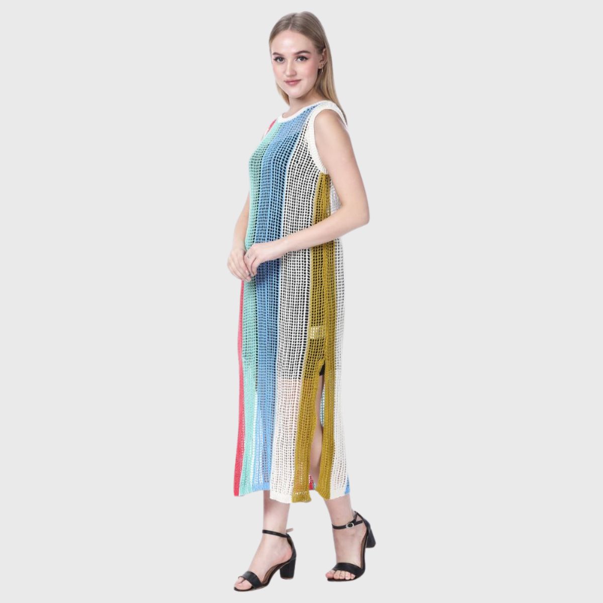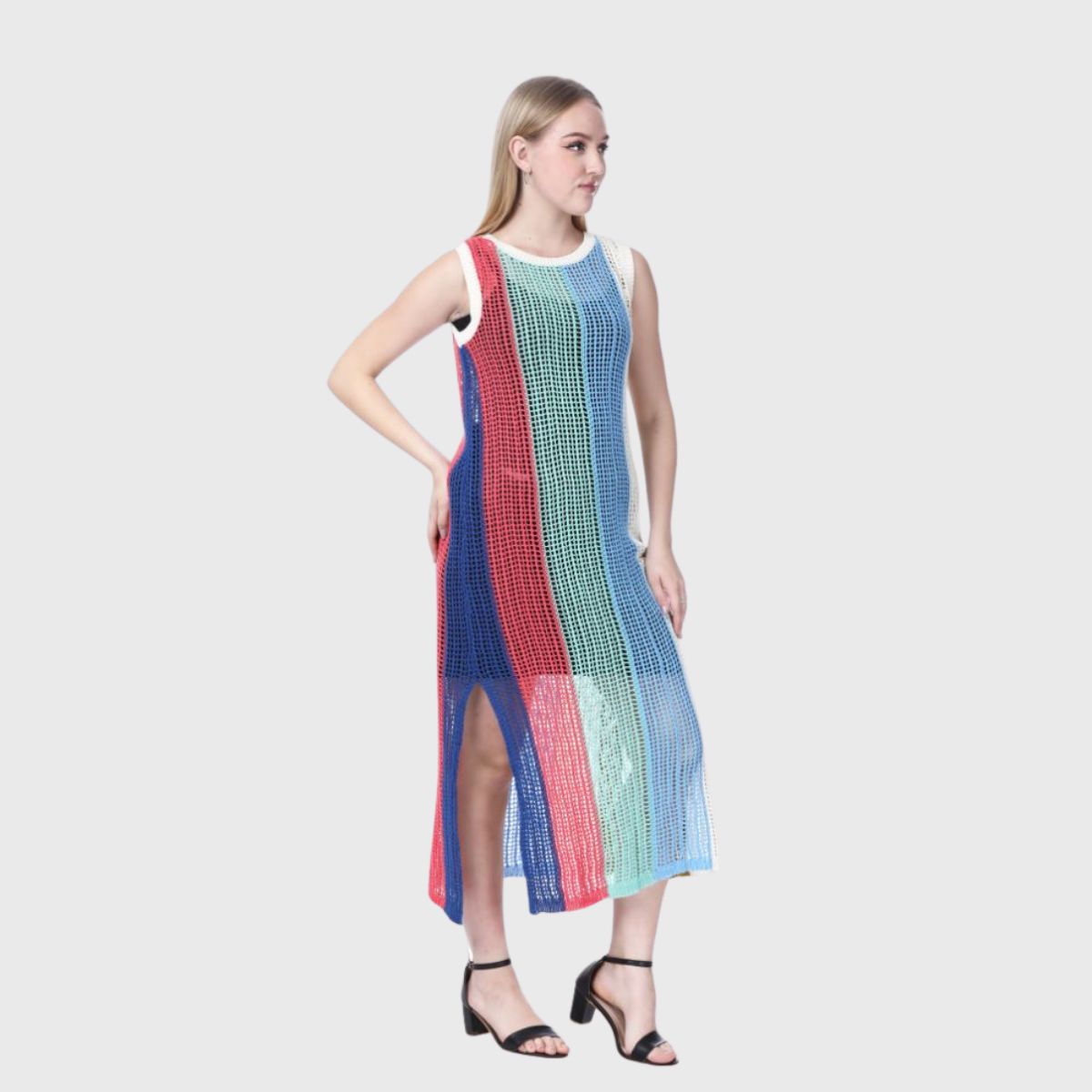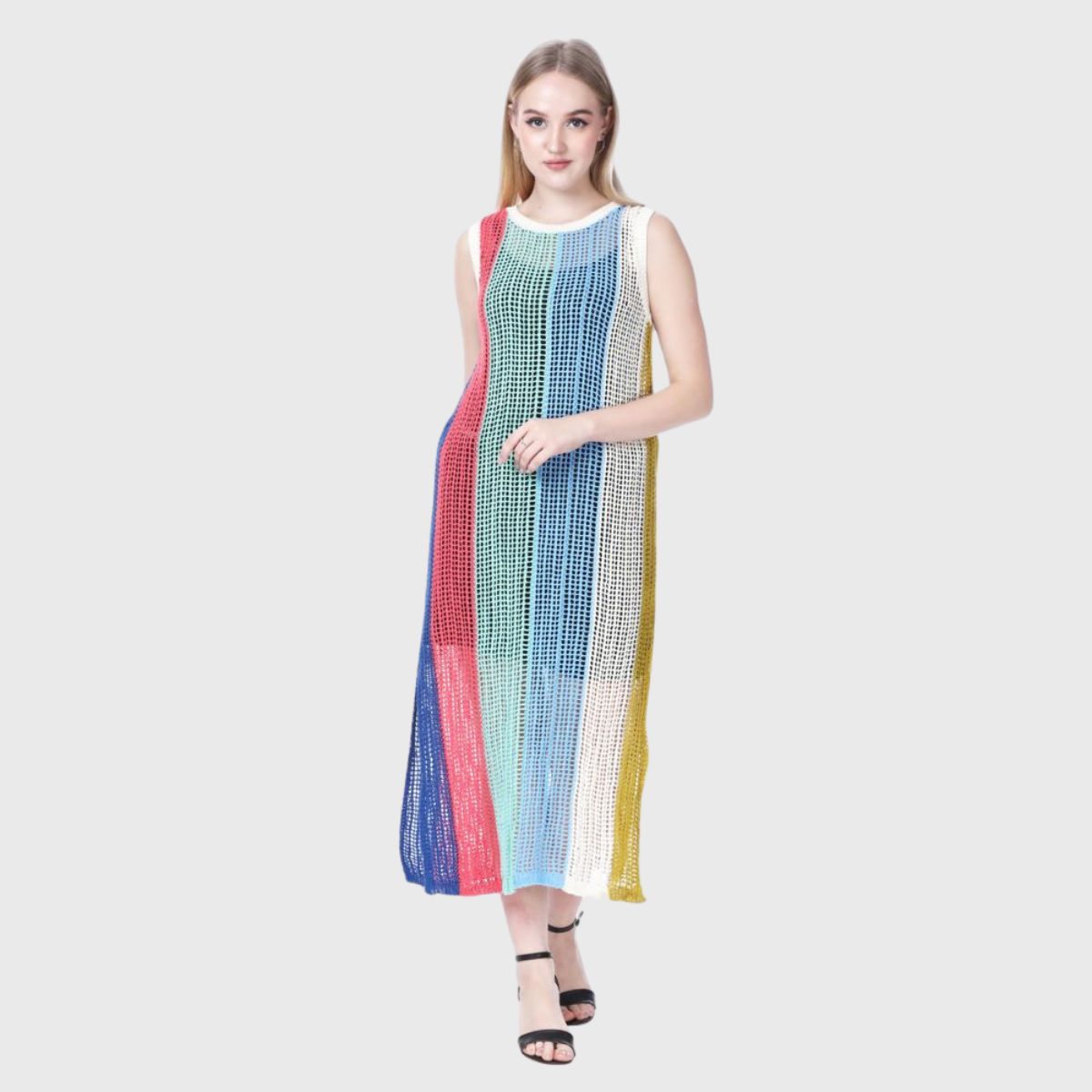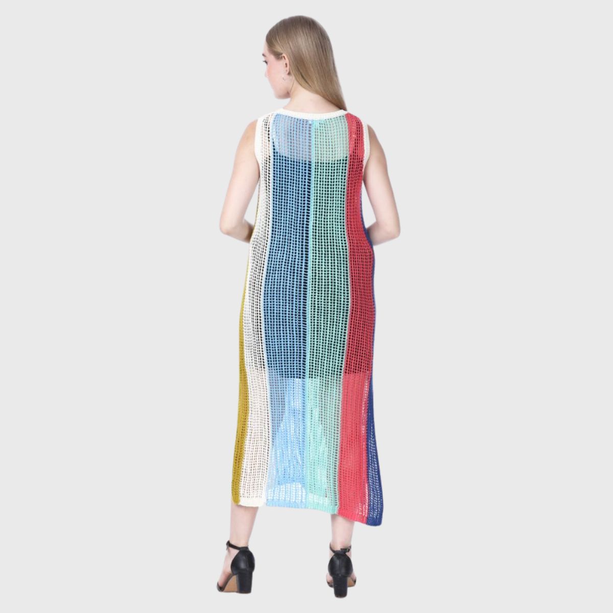 Noquo’s multicolor crochet dress is a summer essential. Featuring handcrafted open-knit fabric in eye-catching stripes, this sleeveless midi is perfect as a beach cover-up or festival outfit. Lightweight, breathable, and stylishly relaxed—effortless layering never looked this beautiful.
