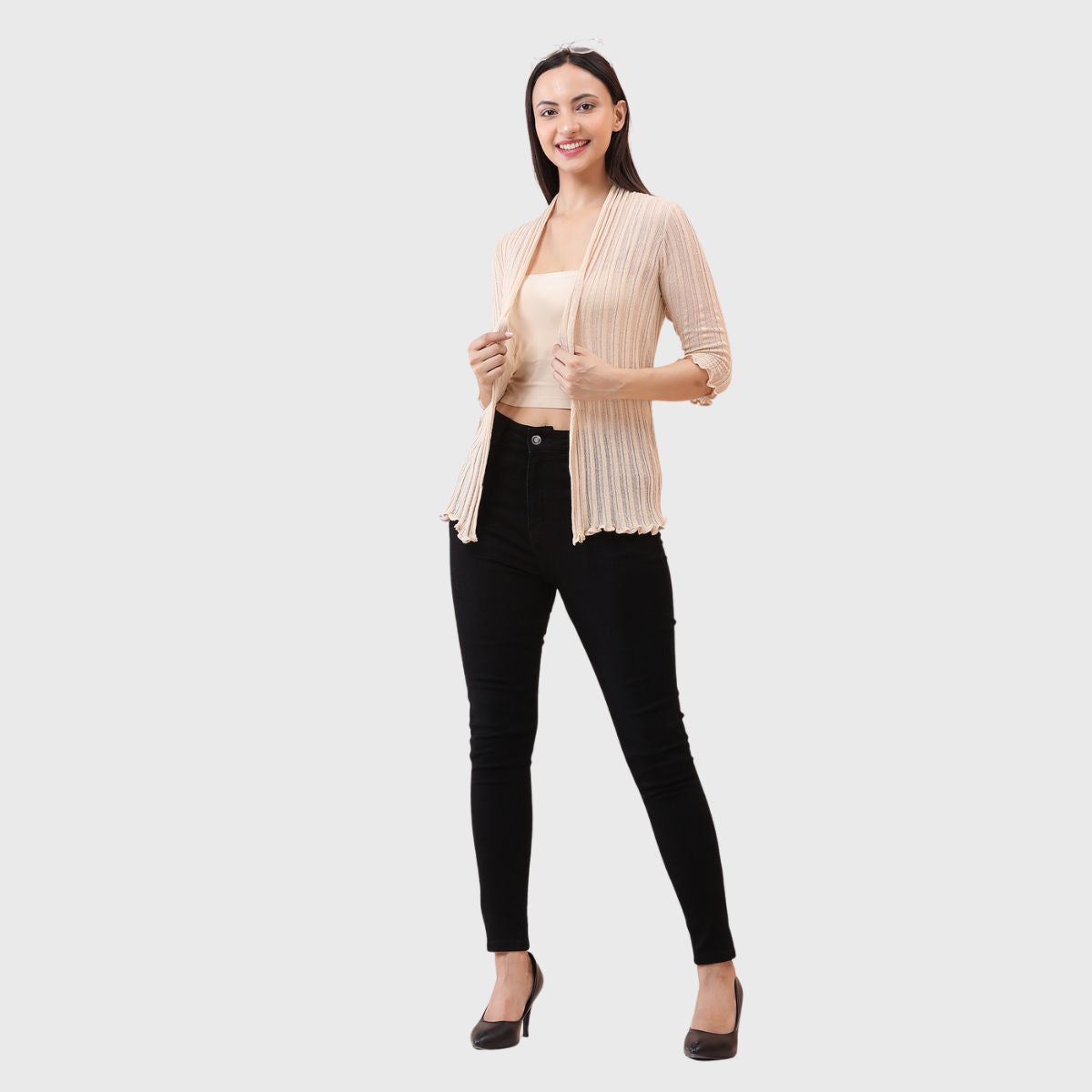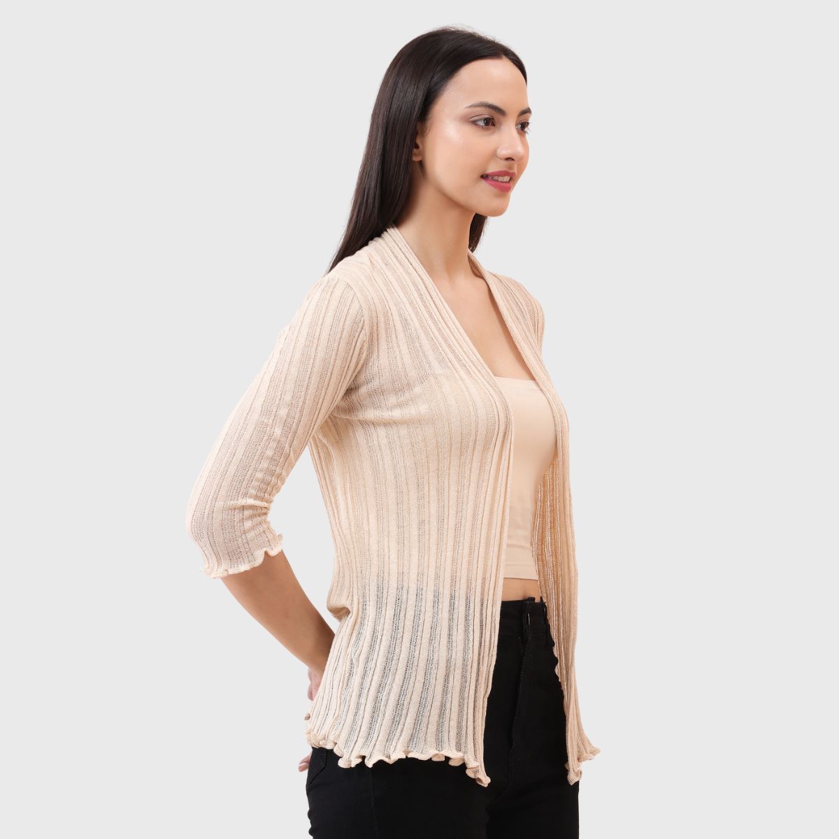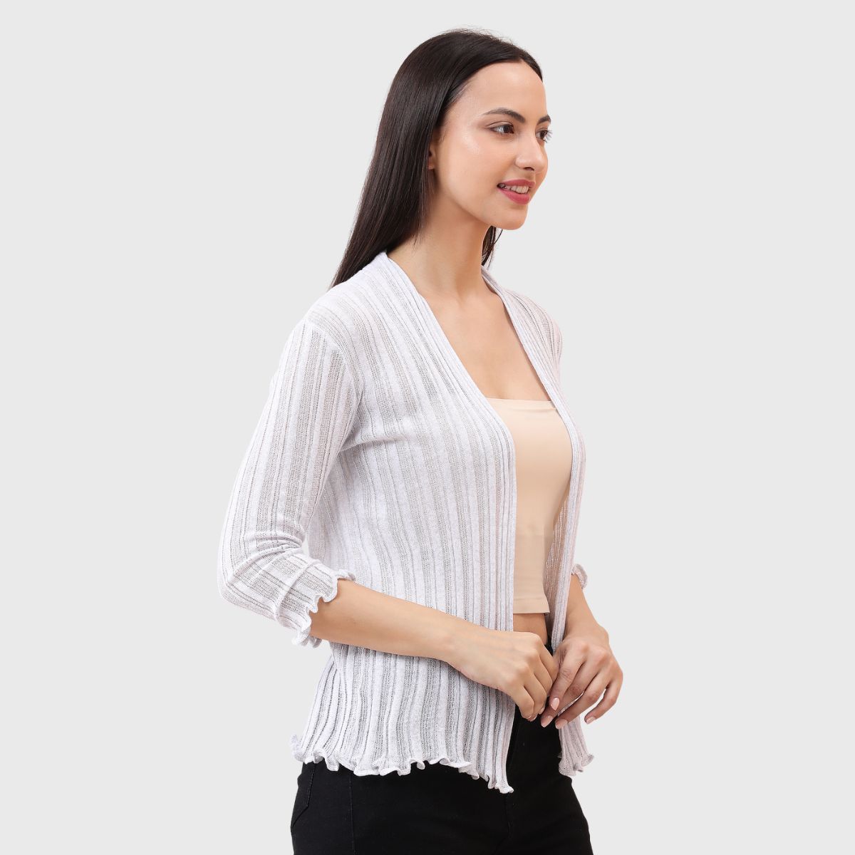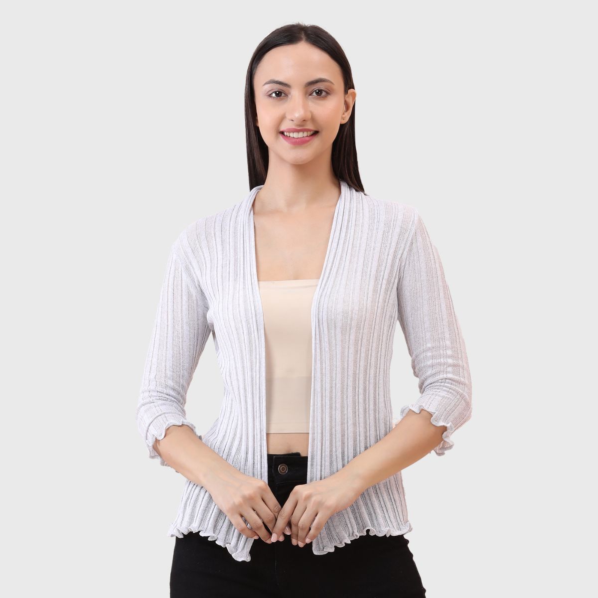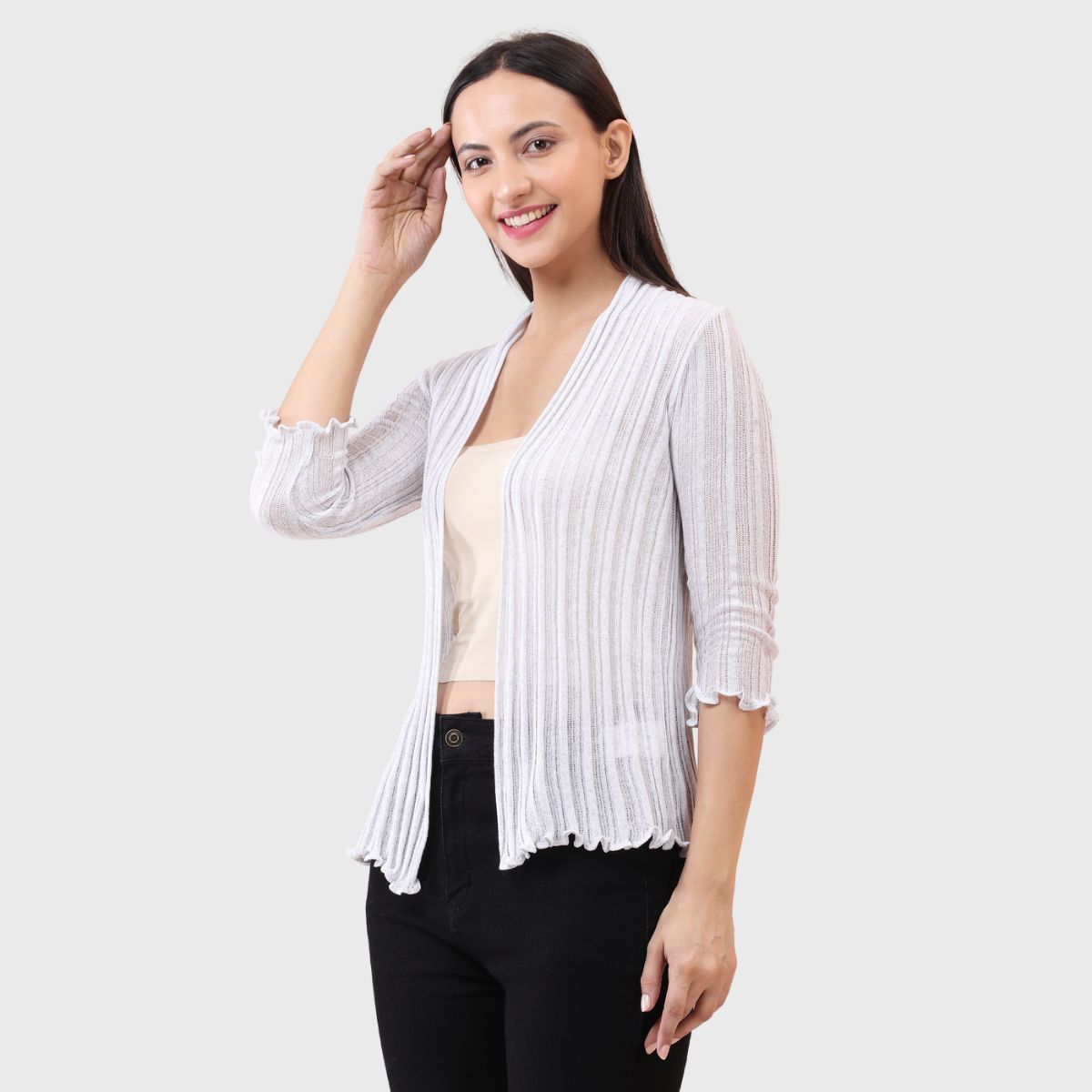 Elevate your layering game with this NOQUO ribbed open-front shrugs. Made from soft, stretchable knit, it features three-quarter sleeves and lettuce-edge hems. The relaxed fit and neutral color make it perfect for pairing with various outfits, whether for work or casual outings. Easy to style and care for, this shrug is a must-have for effortless everyday fashion.